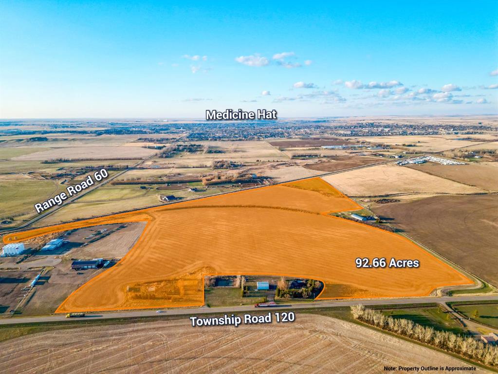 Excellent 92.66-acre dryland farm parcel located just 3 km south of Medicine Hat on Township Road 120. This well-positioned property offers direct paved access connecting Highway 3 and Highway 1, providing convenient transportation links for agricultural operations. Currently used for dryland farming, the land was previously under irrigation via SMRID (no water rights transfer with the sale). The property sits in close proximity to multiple agricultural service businesses, making it highly functional for ongoing farming activities. Zoned Highway Commercial, this parcel presents outstanding land banking opportunity with strong potential for future value appreciation due to its strategic location and development potential while remaining ideal for continued agricultural use.