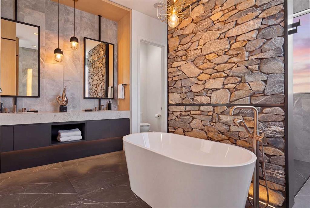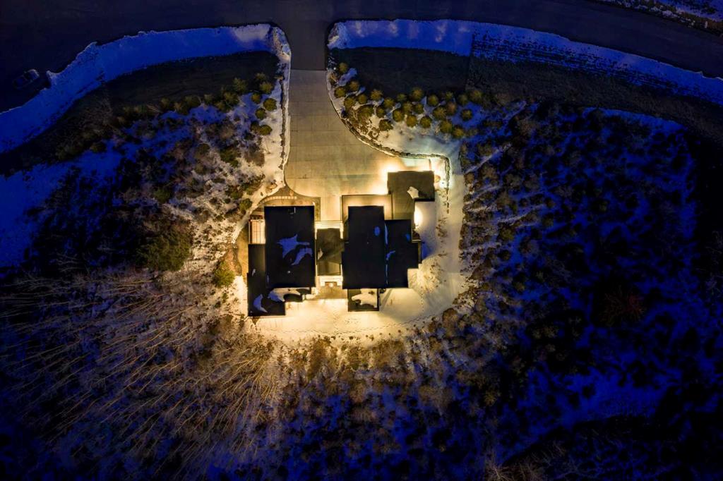 Tucked into 1.77 acres of rolling hills and mature trees in the estate community of Silverhorn, 105 Silverhorn Ridge quietly redefines the acreage category. Built by award-winning West Ridge Fine Homes, this two-storey walkout offers nearly 7,000 SF across three levels — architectural, warm, and connected to nature. The main floor opens to 14\' ceilings in the great room, where three elevations of floor-to-ceiling windows in a post-and-beam grid frame the landscape and pour in S/SW light. A linear gas fireplace with metal-paneled facade and stacked ledgestone columns anchors the room. The kitchen is purpose-built for entertaining: a full Miele package with eight-burner dual-oven gas range, paneled built-in fridge and freezer, and dishwasher; black leathered stone counters with waterfall-edge island; full-height marbled stone backsplash; and integrated pantry. The butler\'s pantry adds a Miele coffee machine, combi-steam oven, and 100+ bottle wine fridge. The dining room sits in a glass enclosure that feels like eating among the trees; the breakfast nook is built for unhurried mornings. Three decks extend the main floor outdoors: a covered patio with BBQ hookup, a pergola sundeck with S/SW exposure, and a central sunrise deck off the nook, foyer, and primary suite. The main-floor primary retreat features a custom built-in bed frame and floor-to-ceiling headboard with tufted velvet, custom millwork, antiqued mirror panels, integrated pendants, and hidden motorized footboard TV. A glass wall delivers light from two elevations with direct deck access. The spa ensuite offers in-floor heat, freestanding soaker tub, floating dual vanity, dedicated makeup vanity, oversized curbless shower with black-framed tinted glass and five-function system, and separate water closet. The walk-in connects to the laundry. An open-riser staircase wrapped in windows leads upstairs to two bedrooms with walk-ins and private ensuites, plus a bright executive office with tinted glass feature wall. The walkout lower level is built for entertaining. Radiant in-floor heat runs throughout. A three-sided gas fireplace with shelving separates the conversation area from a striking wet bar in Japanese charred wood cladding with stainless kegerator, wine fridge, and dishwasher. The space steps down through a games area into a sunken theatre with quartz projection screen, ceiling-mounted projector, and surround sound. Two more bedrooms with private ensuites and walk-ins, a spa bath with steam shower, a gym, and a wine cellar that steals the show round out the level. The heated, epoxy-floored triple-door garage fits up to five cars (or three plus workshop), with ceiling height for a lift. Additional features: metal frame structure, natural stone accents, smart home automation, automated roller shades, irrigation, exterior lighting, stamped concrete driveway, frameless tempered glass railings, speaker zones, and STEP septic. Book a showing to experience 105 Silverhorn Ridge — and Silverhorn itself.
